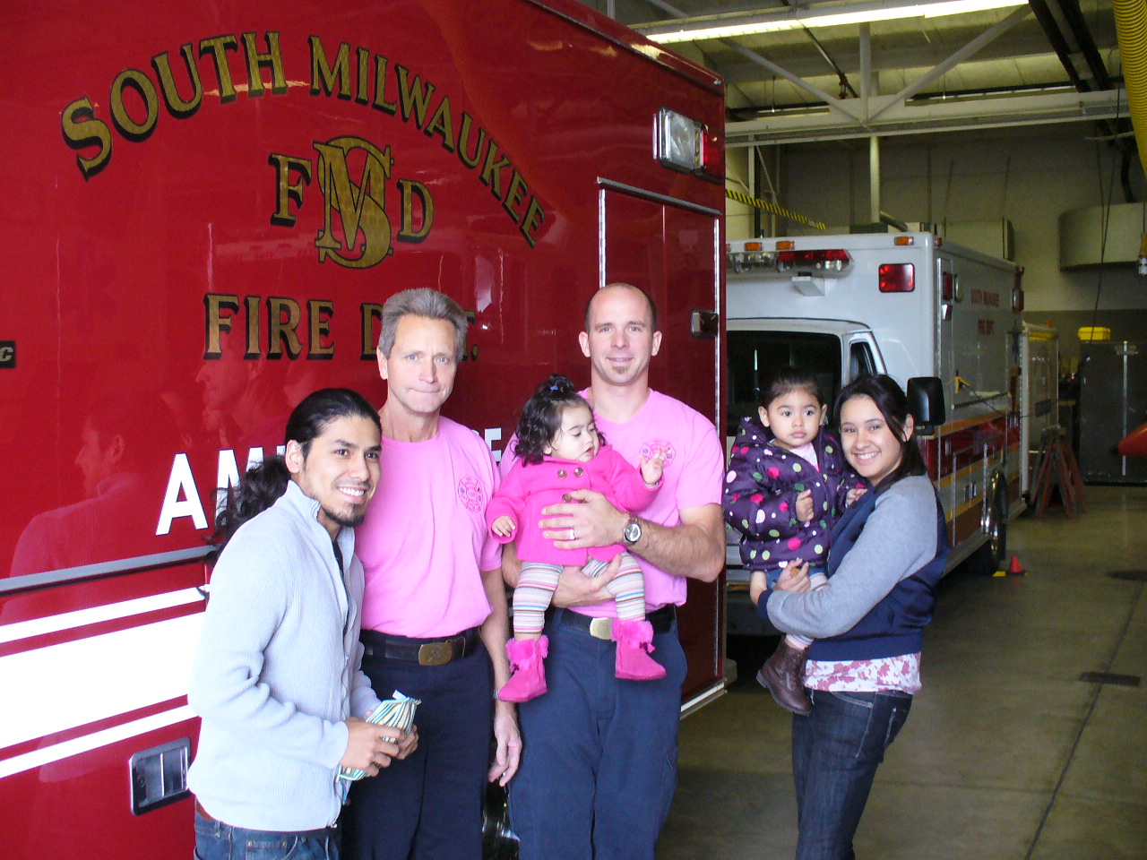 From left to right in the photo are father Juan Cazares, firefighter/paramedics Tim Wendt and Ryan Kurz, Anya, Alana (Anya’s 2-year-old sister) and mother Lauren Figueroa.