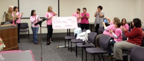 Pink delivered some green at Tuesday’s City Council meeting, as students from South Milwaukee schools presented checks totaling more than $11,000 to representatives from the Susan G. Komen Foundation during a brief ceremony.