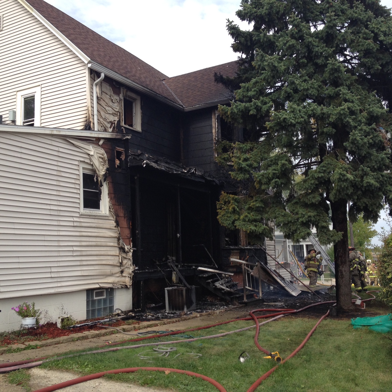 At approximately 1140AM this morning, South Milwaukee Dispatch received several 9-1-1 calls reporting a house fire at 1213 Rawson Avenue. The house is a duplex, with a total of 9 occupants residing in it. A “Working Still”, which brings in our first alarm level of mutual aid, was called immediately based on the information of the callers. First arriving South Milwaukee Fire Department units encountered significant fire on the east side of the house extending up the siding and exposing the 2nd floor and attic. In addition, a large pine tree that was very near the house was burning adding to the amount of fire and smoke. Initial reports were that all occupants were out of the house.