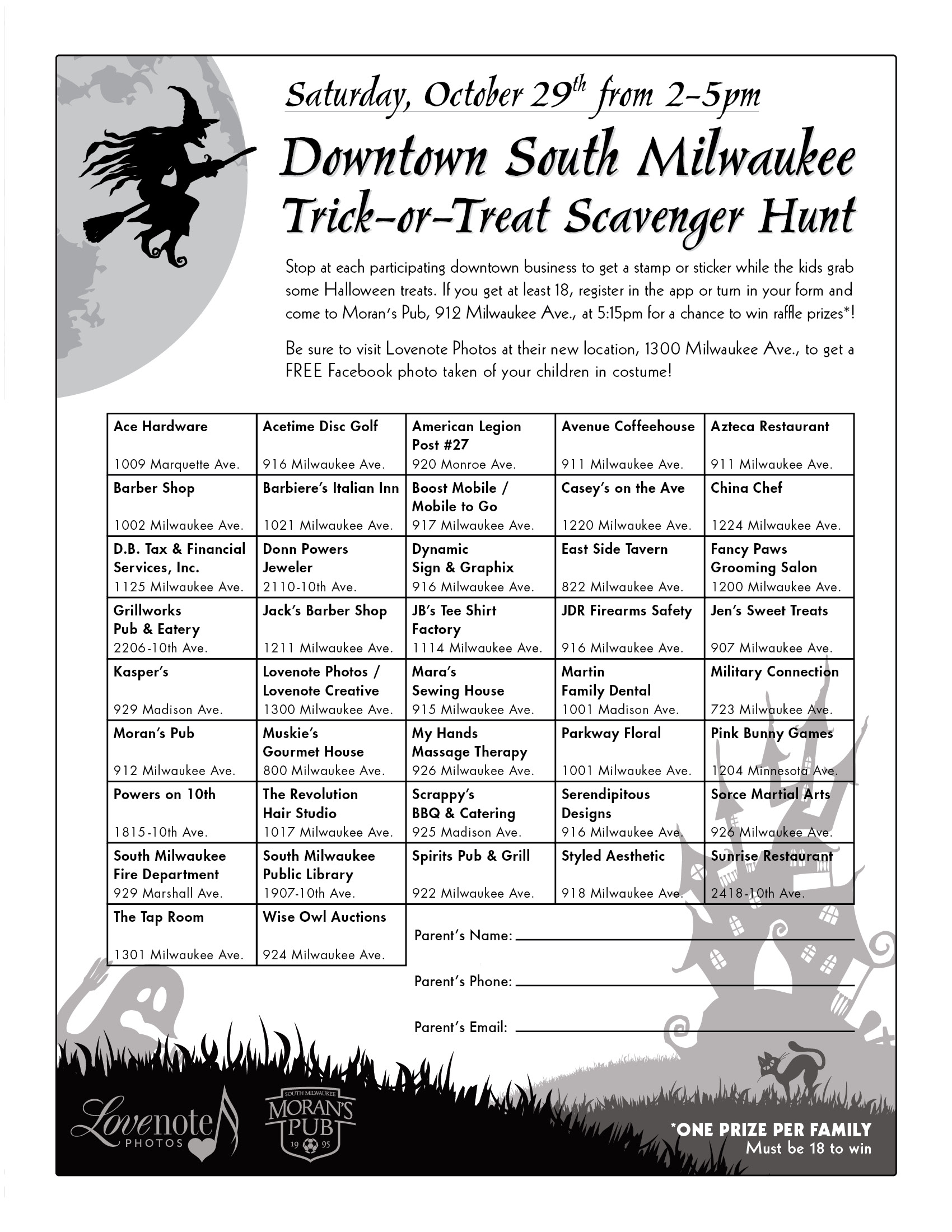 - How it works: It’s simple. Start by printing the scavenger hunt form, picking up a copy at a participating business, or downloading the app (there is an app this year). Stop at each participating downtown business and have them mark the form, or log your visit on the app using a QR code, while grabbing some Halloween treats. If you visit at at least 18 merchants, register on the app or turn in your form at Moran’s Pub, 912 Milwaukee Ave., at 5:15 p.m. for a chance to win raffle prizes.