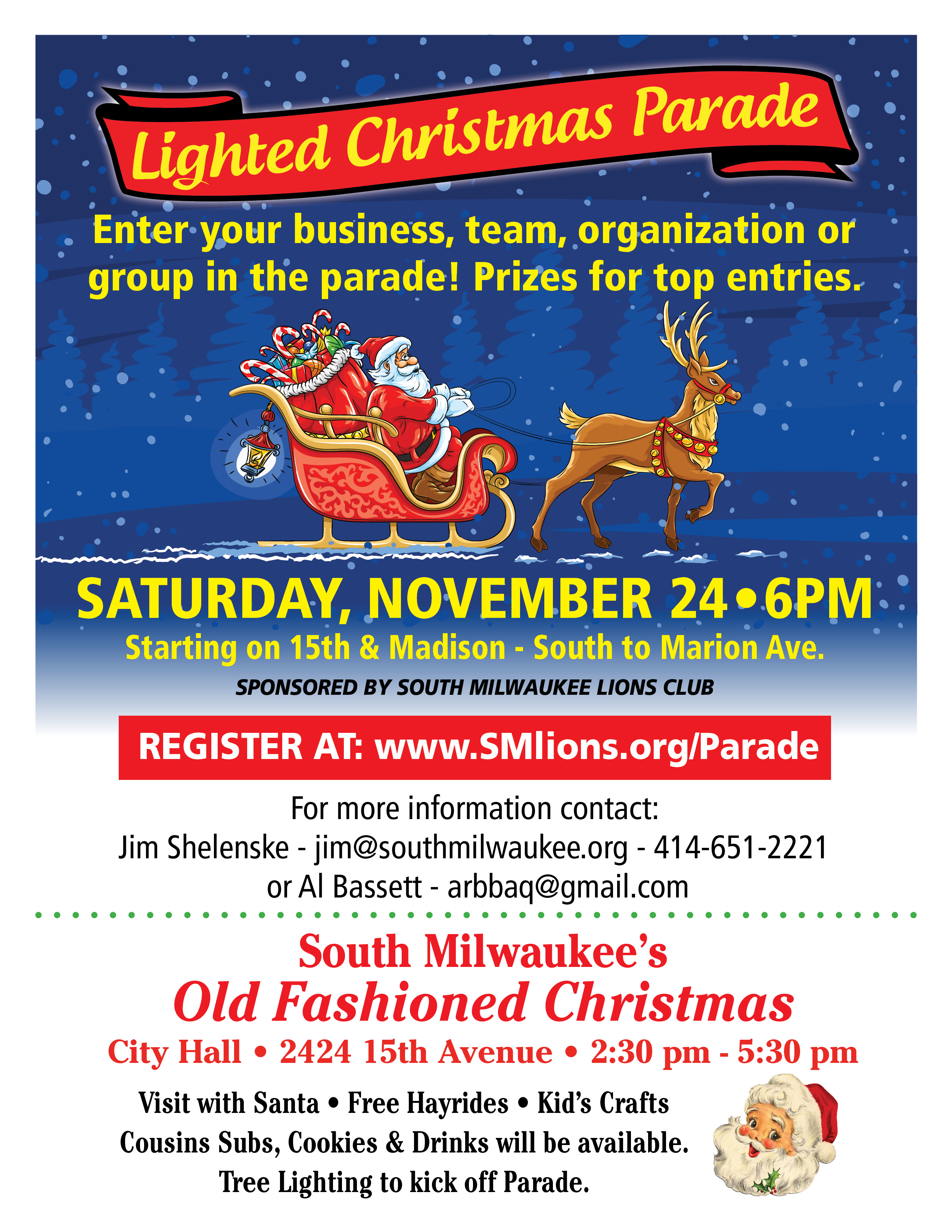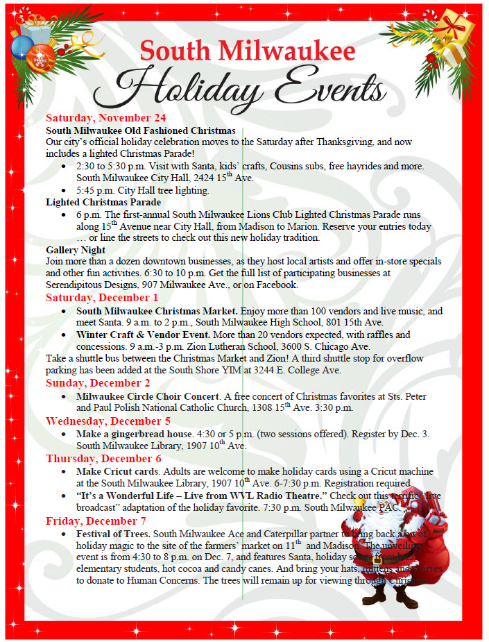 - 6 p.m. The first-annual South Milwaukee Lions Club Lighted Christmas Parade runs along 15th Avenue near City Hall, from Madison to Marion. There is still time to enter … or line the streets to check out this new holiday tradition.