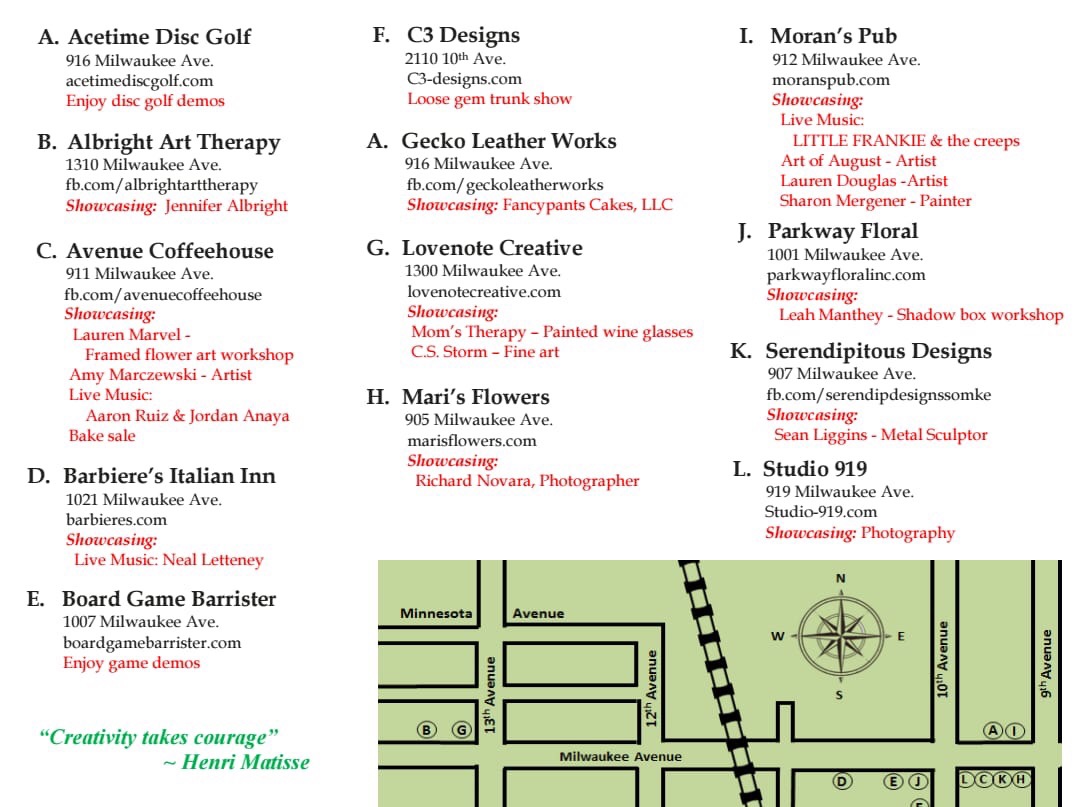 - 6:30-10 p.m. Join more than a dozen downtown businesses, as they host local artists and offer in-store specials and other fun activities. The full list of participating businesses is with this post.