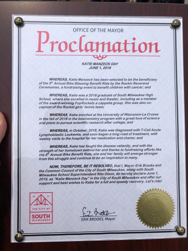 I was proud to declare June 1, 2019, Katie Manzeck Day in South Milwaukee, in support of this special young woman and her battle against cancer.