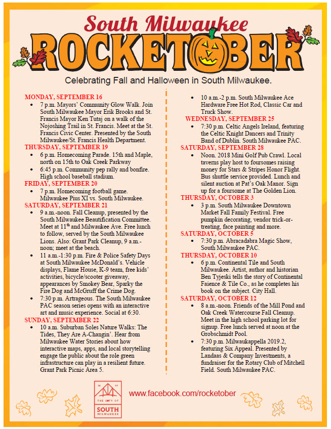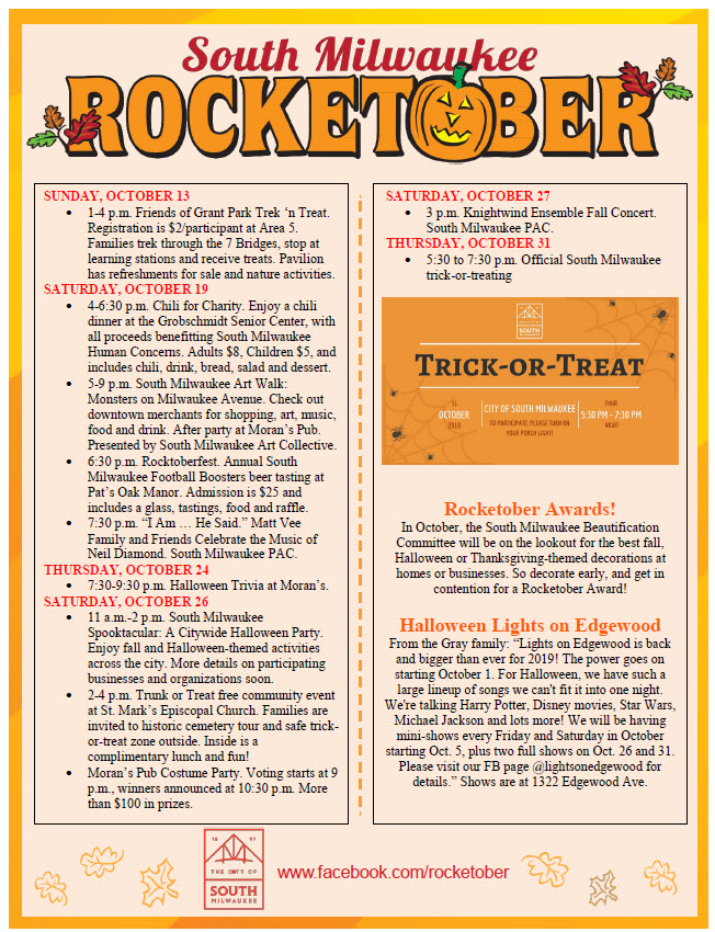 Many of your fall favorites are back, starting with Homecoming activities this week, ending with Halloween night time trick-or-treating, making South Milwaukee the only community in the county to keep this tradition. In between are some great South Milwaukee Performing Arts Center shows and other special special events. And check out the information on the Halloween Lights on Edgewood, back bigger and better in 2019.