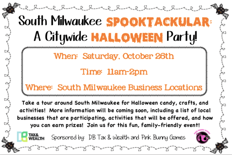 South Milwaukee families and kids of all ages: Don’t miss out on our new “Spooktacular” Halloween event on Saturday, Oct. 26, from 11 a.m. to 2 p.m. Mark your calendars as we deliver a citywide celebration of what makes fall and Halloween so special.
