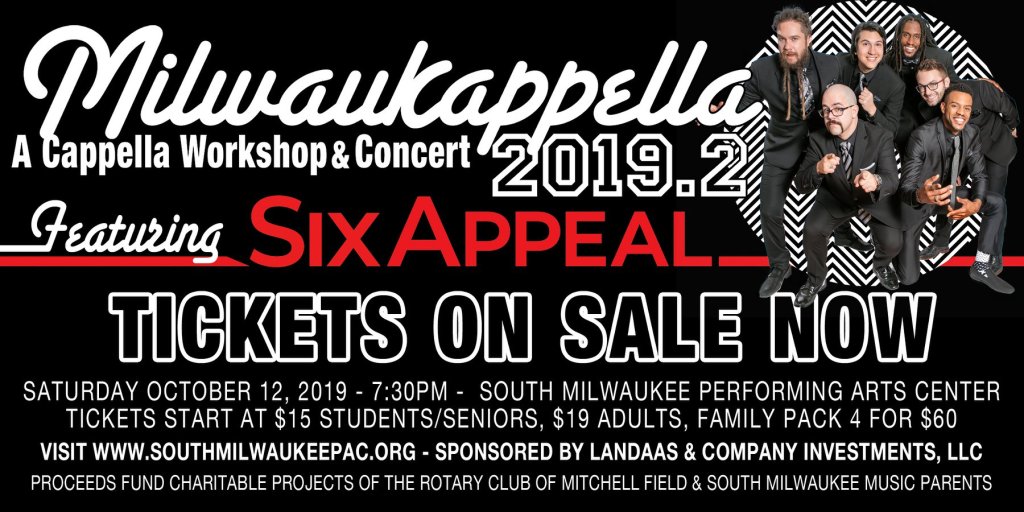 If you love a cappella music you’ve got to see and hear Six Appeal! Tickets for students and seniors – $19 in advance. Discount packages available. Children 4 and under are free.