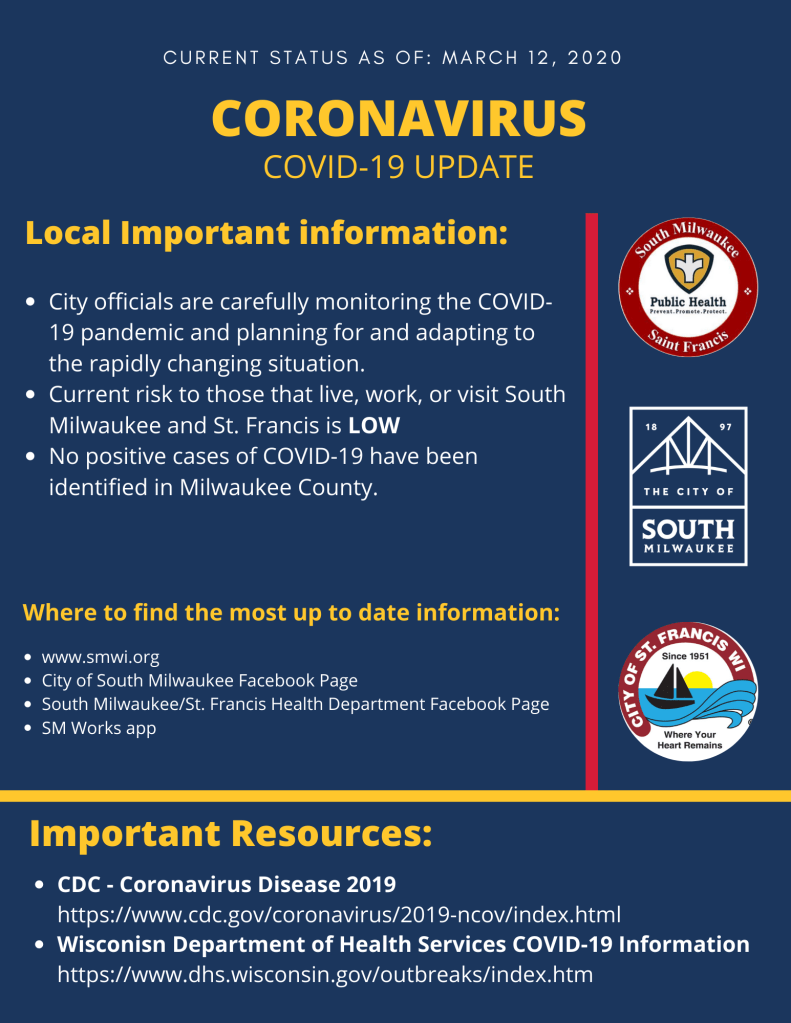 Our public buildings remain open. However, we are taking steps to keep frequently visited buildings – the Grobschmidt Senior Center, South Milwaukee Library, South Milwaukee City Hall and South Milwaukee Police Department – safe. This includes enhanced cleaning and disinfecting processes.