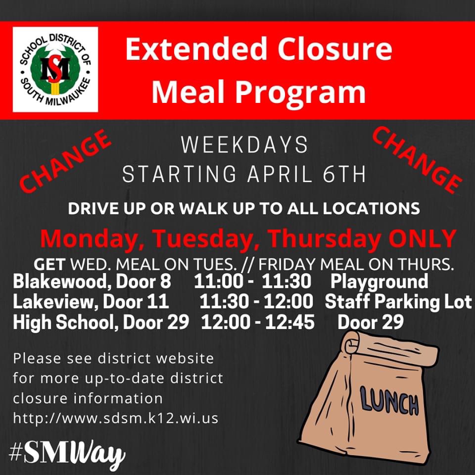 From the South Milwaukee School District Facebook page: “Thank you to our district essential workers! Did you know that 12,704 meals (6,352 lunch meals, 6,352 breakfast meals) have been assembled and served by our Nutrition Services Department since March 18? The community appreciates your service! #SMWay If you haven’t stopped to get a lunch or breakfast you still can. Days, times and locations are in the graphic or on district website. http://www.sdsm.k12.wi.us/.”