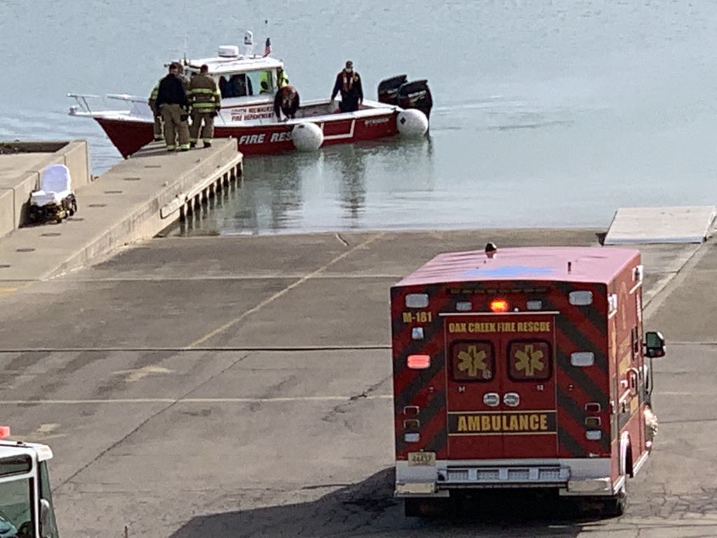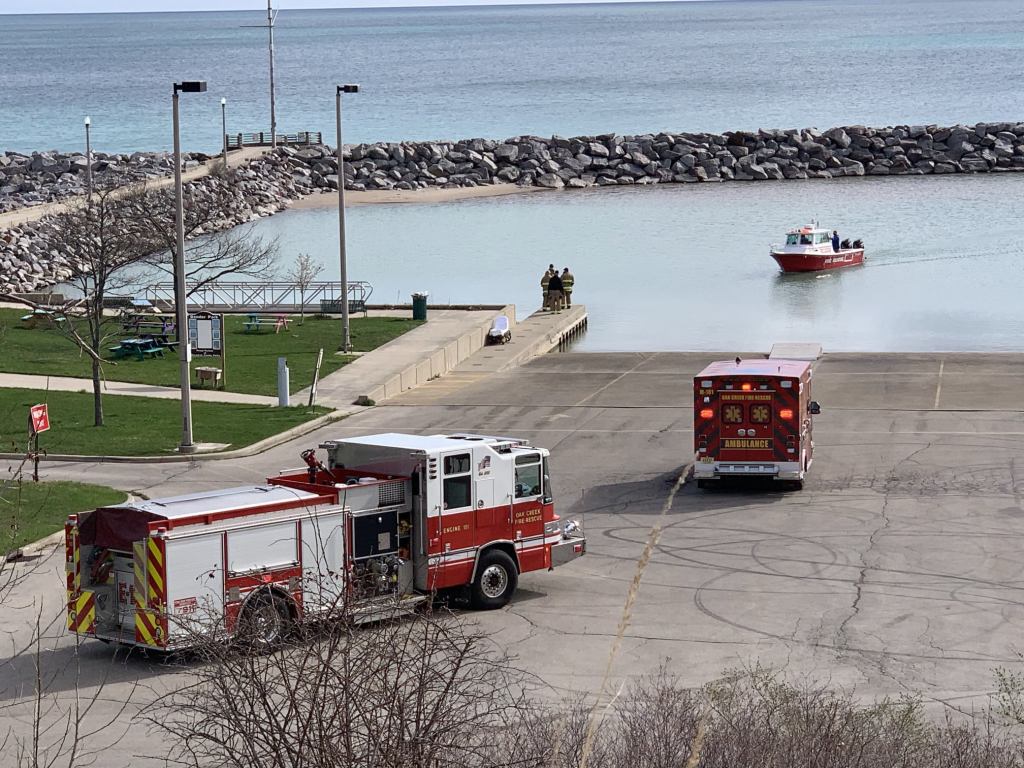 Earlier today, the SMFD Rescue Boat, Guardian II, was requested by the Oak Creek Fire Department to respond for a report of a pilot-less boat going in circles in Lake Michigan in the area of the WE Energies Plant.