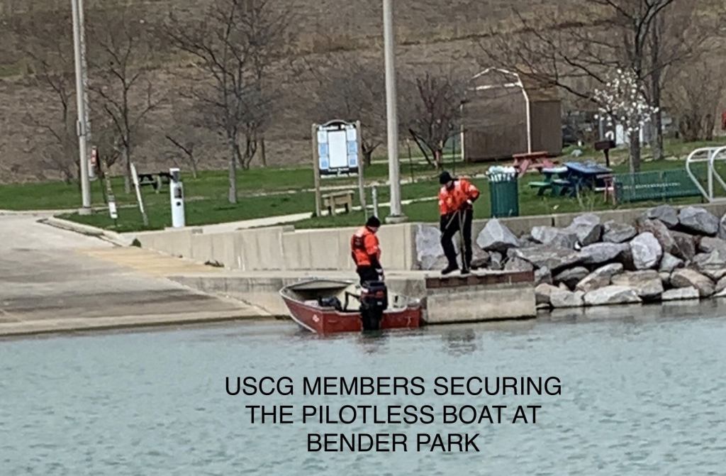 After transferring care of the boater to OCFD, the crew from the US Coast Guard USCG Sector Lake Michigan requested the assistance of SMFD in securing the pilotless boat. Eventually, after attempting several maneuvers to control the boat, a member of the USCG had to jump into the boat and take control of it.