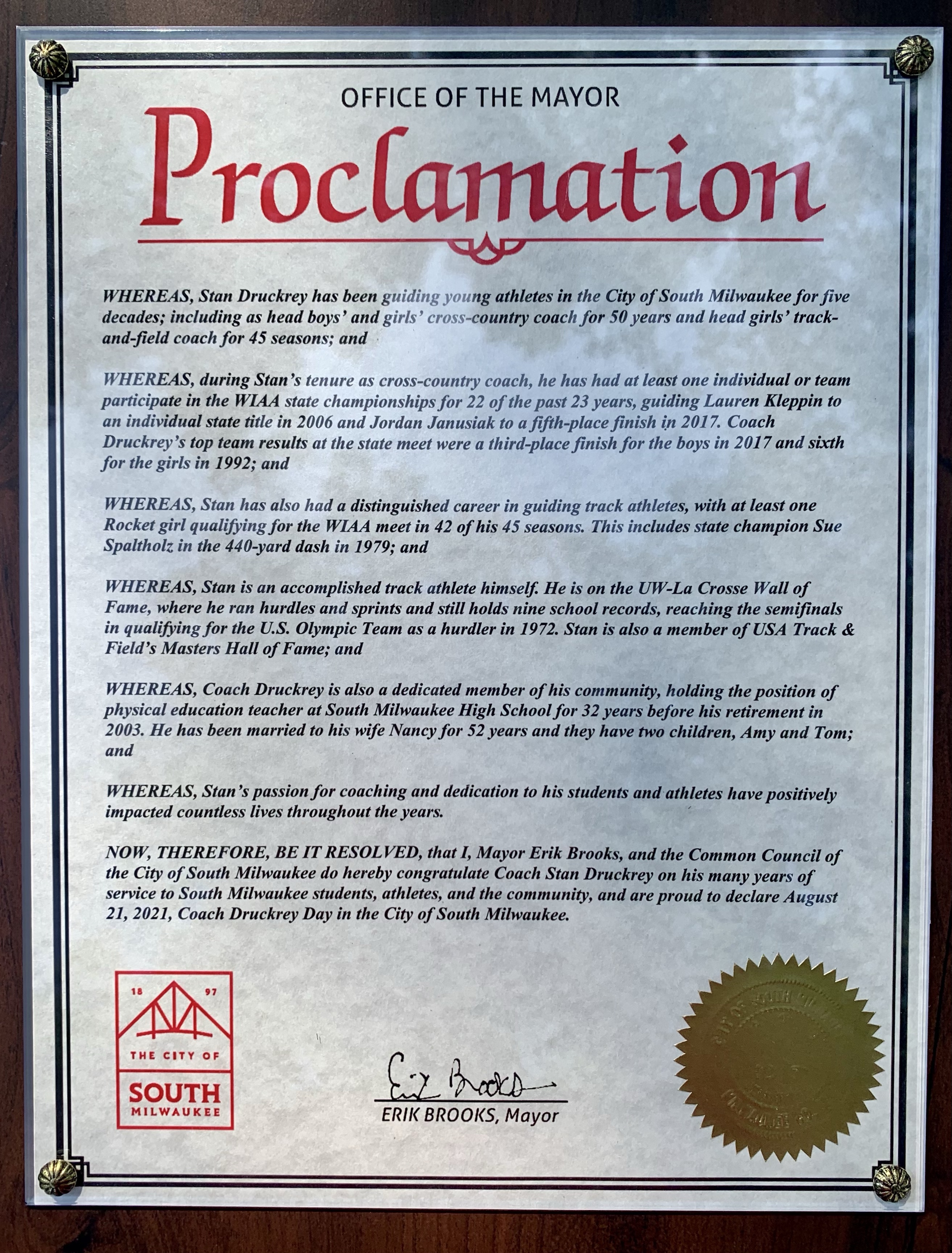NOW, THEREFORE, BE IT RESOLVED, that I, Mayor Erik Brooks, and the Common Council of the City of South Milwaukee do hereby congratulate Coach Stan Druckrey on his many years of service to South Milwaukee students, athletes, and the community, and are proud to declare August 21, 2021, Coach Druckrey Day in the City of South Milwaukee.