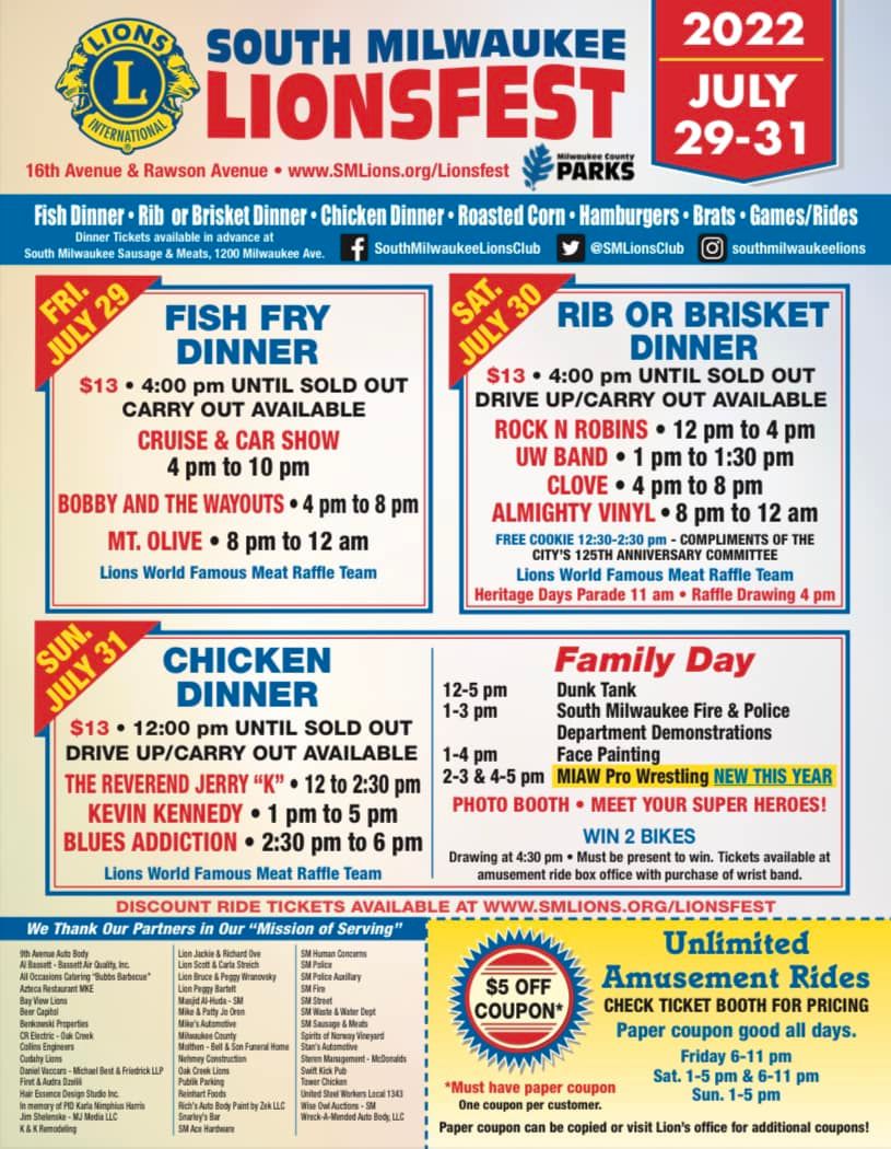 Each volunteer receives a volunteer t-shirt and meal ticket. Please consider helping us put on our largest event for the year, so that we can help within the South Milwaukee community. Please feel free to send us a message if you need help with scheduling using our sign-up link — or email Lion Chelsea at caweirich@gmail.com.