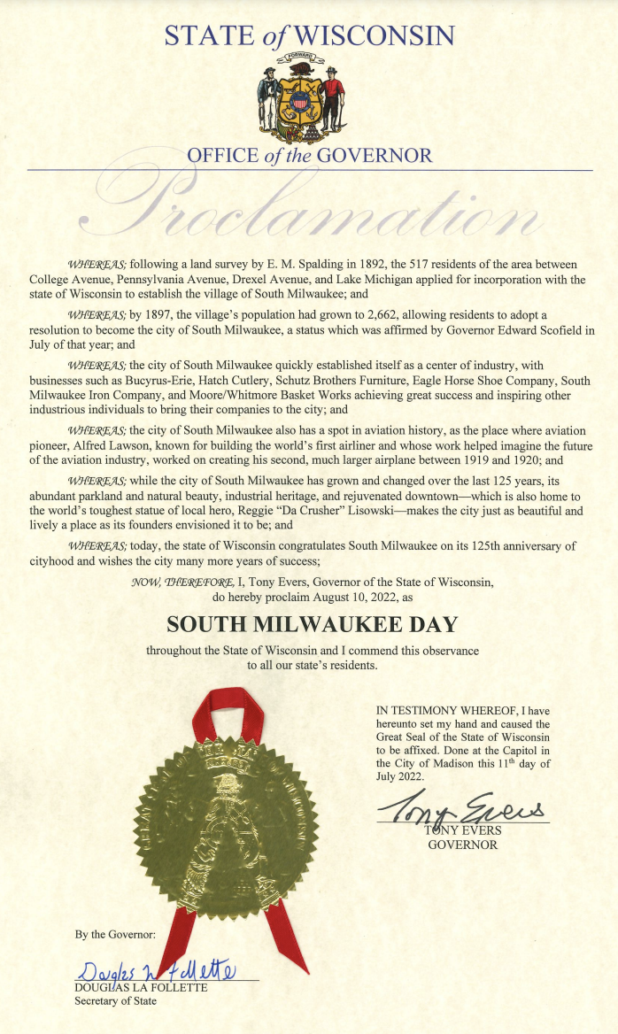In honor of the South Milwaukee 125th Anniversary Celebration, Governor Tony Evers has issued a proclamation that today shall be South Milwaukee Day throughout the state of Wisconsin!