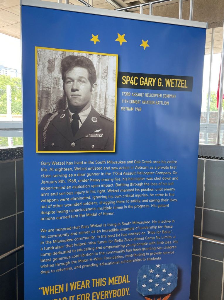 Last week, Gary Wetzel was honored as a part of the War Memorial Center‘s new Wisconsin Medal of Honor Exhibit. Wetzel, a South Milwaukee resident, is one of 64 Wisconsinites who have been awarded the Congressional Medal of Honor. Wetzel served in the U.S. Army during the Vietnam War. He was awarded the Medal of Honor by President Johnson on November 19, 1968.