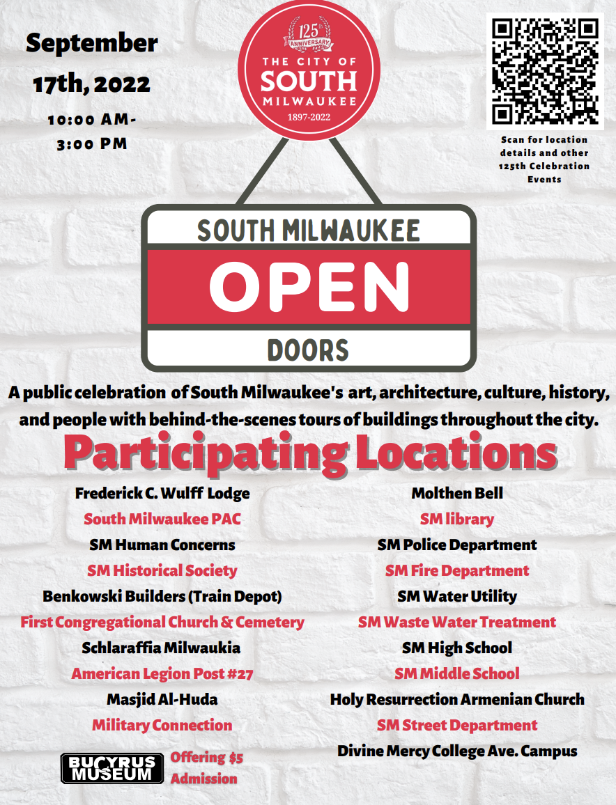 Join us on Saturday, September 17, for South Milwaukee Open Doors, a public celebration of South Milwaukee’s art, architecture, culture, history, and people with behind the scenes tours of buildings throughout the city.
