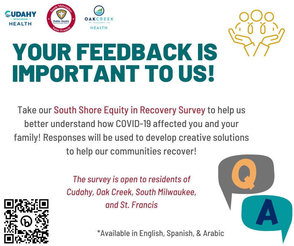 Participation in this survey is voluntary. All responses will remain confidential. The first 300 people who complete the survey will be eligible to receive a $10 gift card. To receive the gift card, you will be asked to provide your name, email, or phone number towards the end of the survey. You must be a resident of Cudahy, Oak Creek, South Milwaukee, or St. Francis in order to be eligible for a gift card. Limit one survey per household.