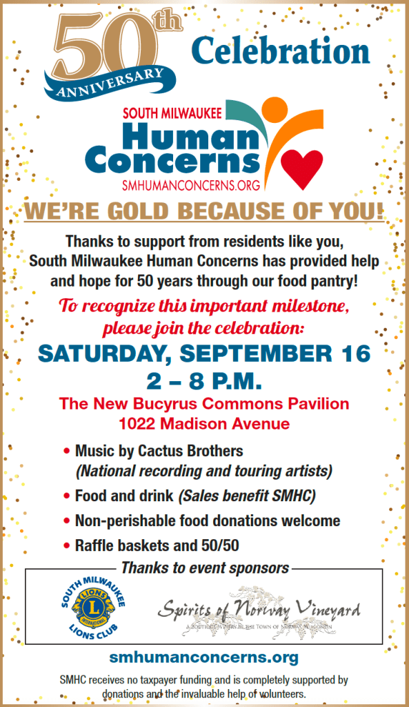 - Saturday, September 16: South Milwaukee Human Concerns 50th Anniversary Celebration, 2 p.m., Bucyrus Commons. Details in flyer.