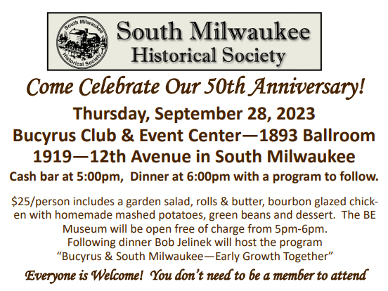 - Thursday, September 28: South Milwaukee Historical Society 50th Anniversary Dinner, 6 p.m., Bucyrus Club & Events Center. Details | Register Here