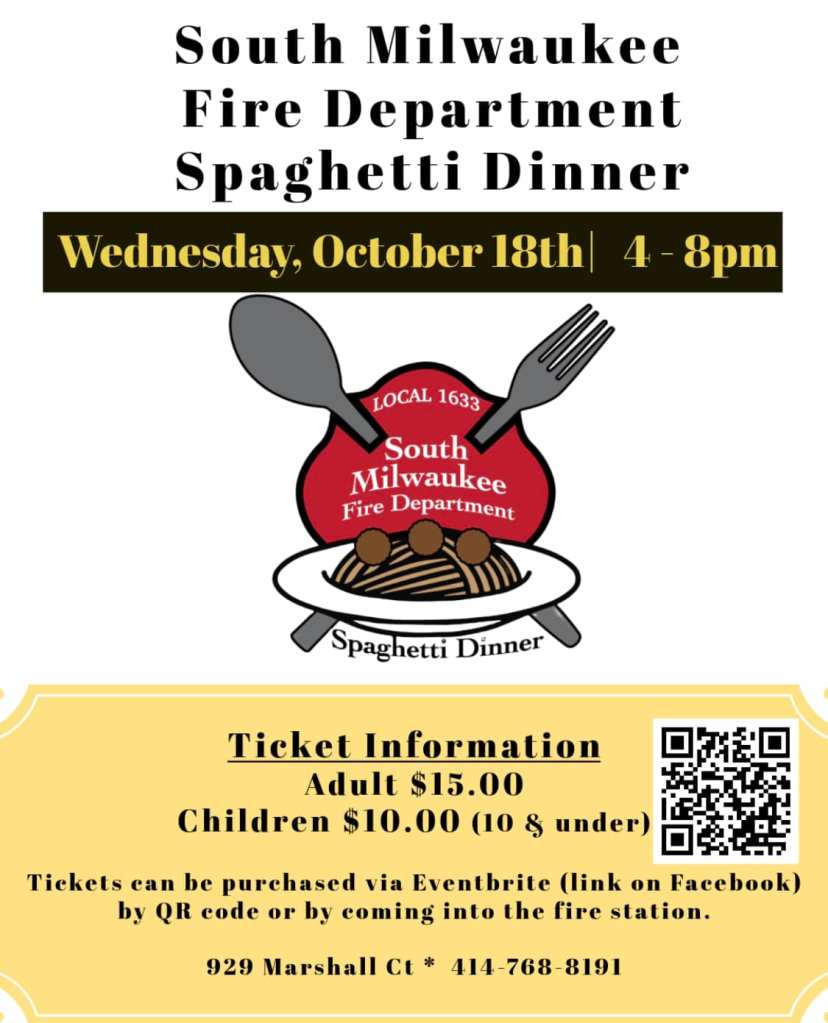 - Wednesday, October 18: South Milwaukee Fire Department Spaghetti Dinner, 4 p.m., presented by Local 1633, South Milwaukee firehouse. Details