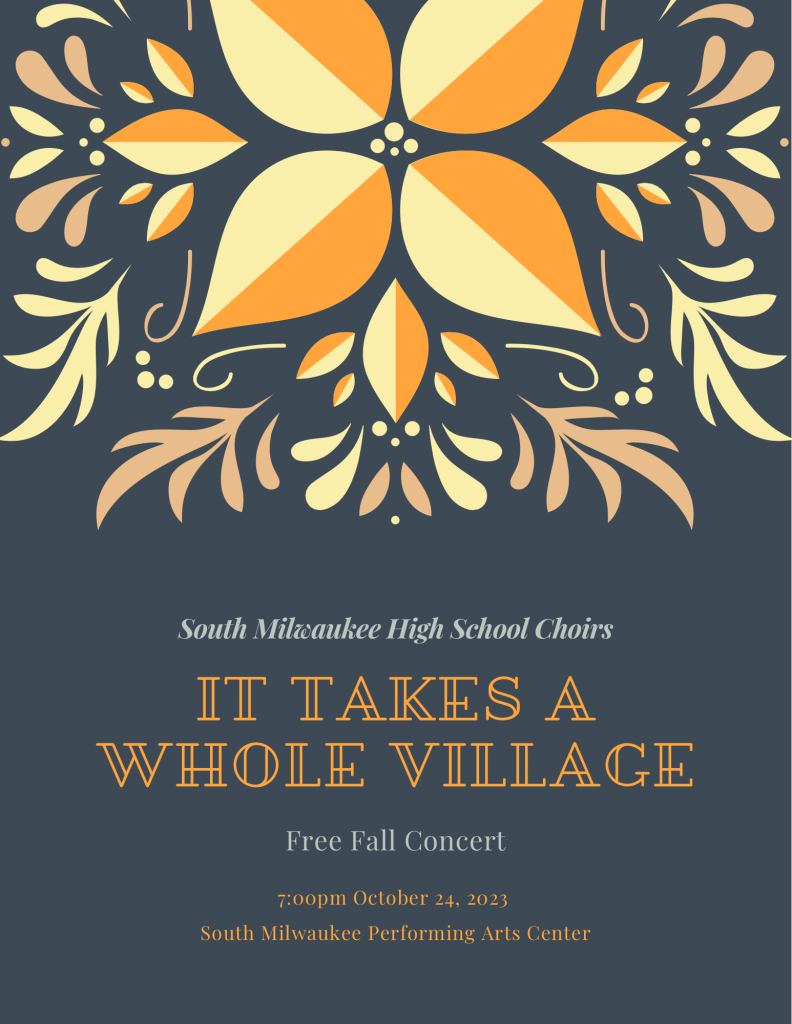 - Tuesday, October 24: “It Takes a Whole Village,” free fall concert from the South Milwaukee High School choirs. 7 p.m., South Milwaukee Performing Arts Center.