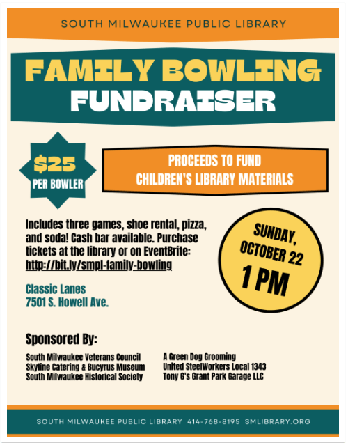 - Sunday, October 22: South Milwaukee Library Family Bowling Fundraiser. 1 p.m., Classic Lanes (Oak Creek). Details