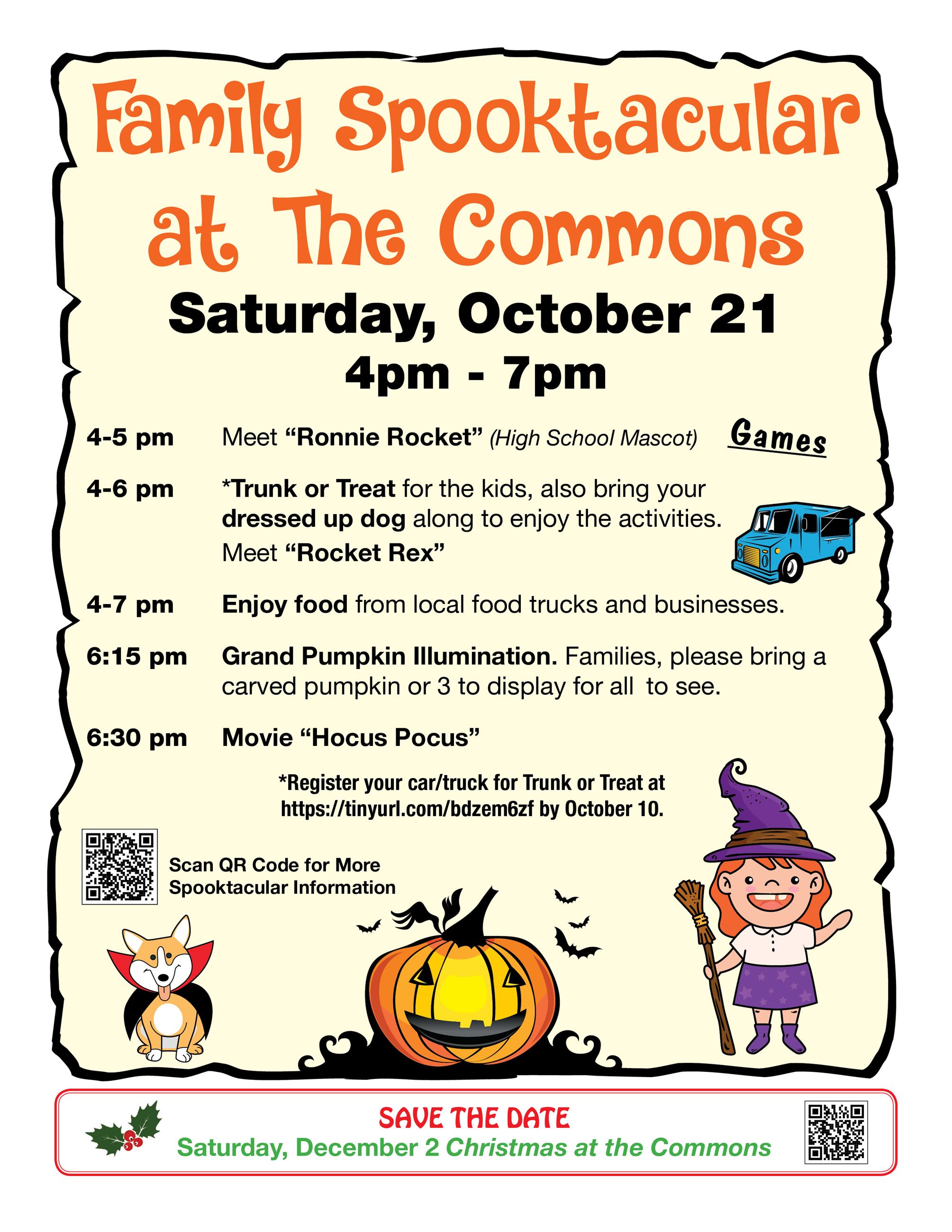 - Saturday, October 21: Family Spooktacular at the Commons. This new family-friend Halloween-themed event will feature a carved pumpkin illumination and end with a spooky outdoor movie. Event starts at 4 p.m., movie at 7. Details