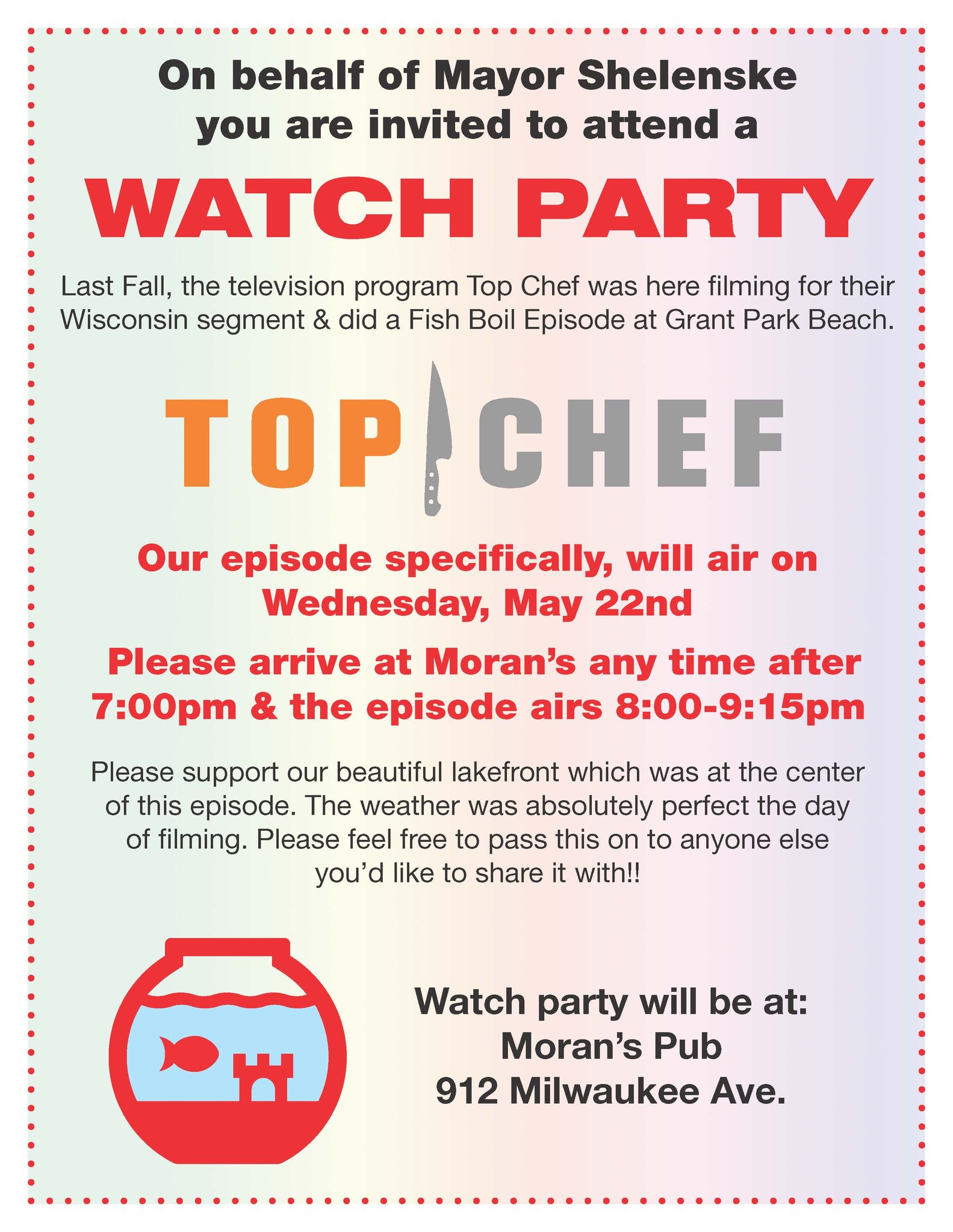 On behalf of Mayor Shelenske, you’re invited to attend a watch party for South Milwaukee’s episode of Top Chef on May 22, 2024 at 7:00pm, with the episode airing at 8:00 pm at Moran’s Pub, 912 Milwaukee Avenue.