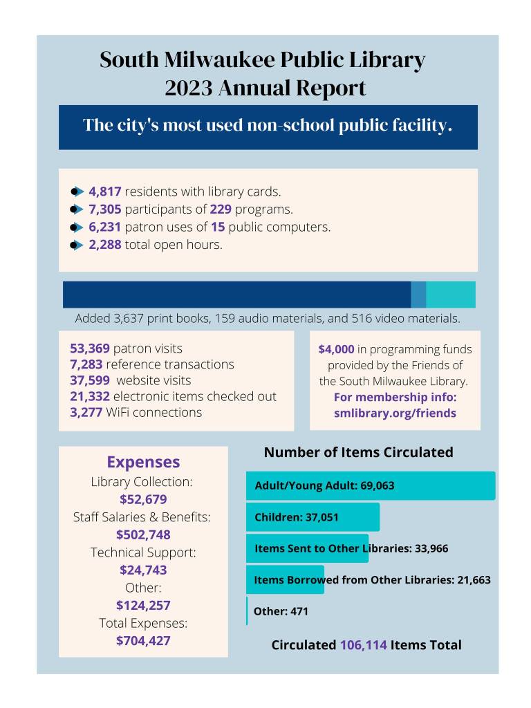There has been a lot of misinformation shared about our library on social media lately. As information professionals, we want to share some facts. This is our 2023 Annual Report which shows our library’s usage for the past year. The City of South Milwaukee is facing significant budget constraints and these affect the library. This coming Tuesday, June 4th, the South Milwaukee Common Council will look at an agenda item to consider a third party study that will evaluate library services in South Milwaukee and present suggestions for library services moving forward.