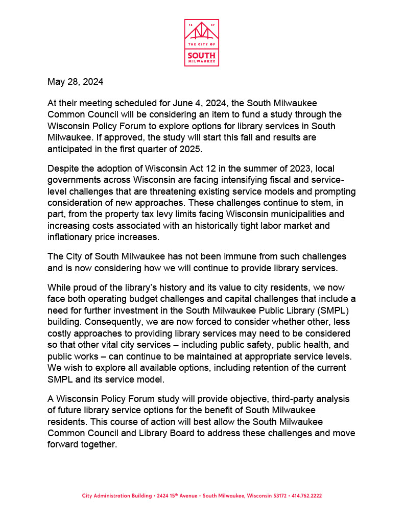 The South Milwaukee City Council on Tuesday, June 4 — meeting time is 7 p.m. at City Hall — will be considering a “motion to approve a scope of services outline from the Wisconsin Policy Forum in an amount not to exceed $14,500 to explore options for library services in the City of South Milwaukee.” Specifically, the Forum would look at:
