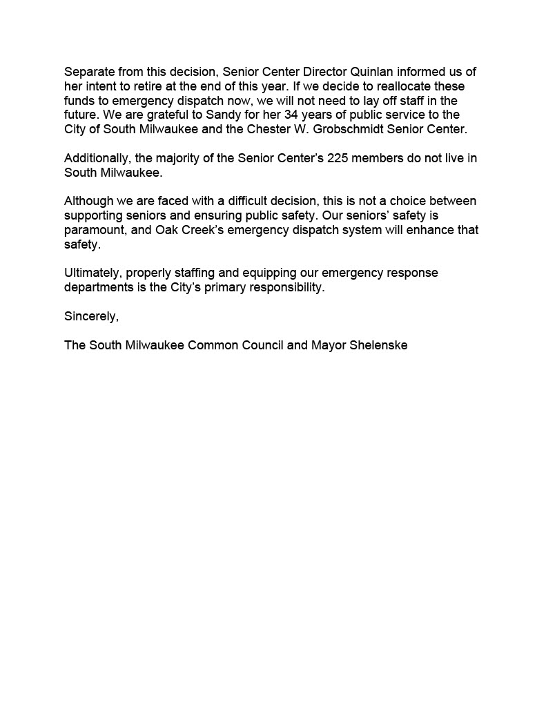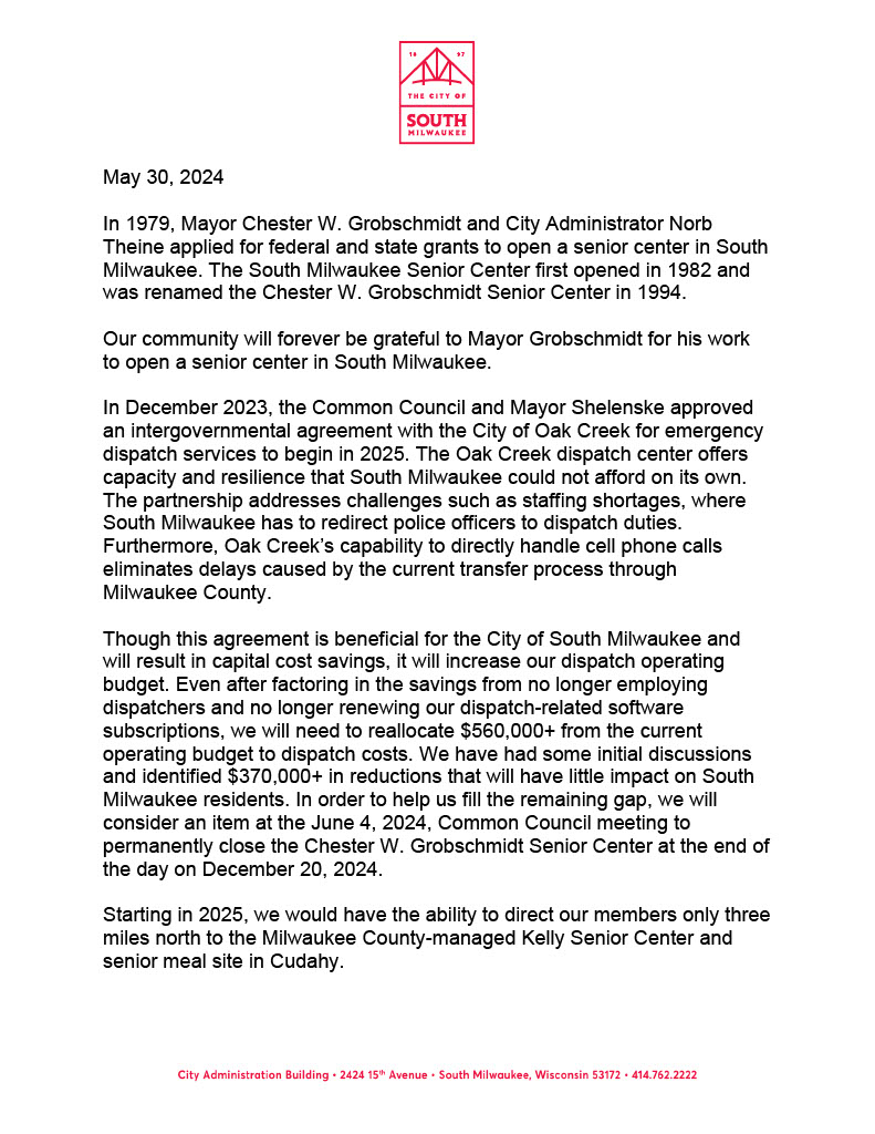 First, the Senior Center. Last week, the city announced it will permanently close the facility at the end of the year, linking the resulting cost savings to the decision to contract with the City of Oak Creek for dispatch services starting in 2025. I support this decision.