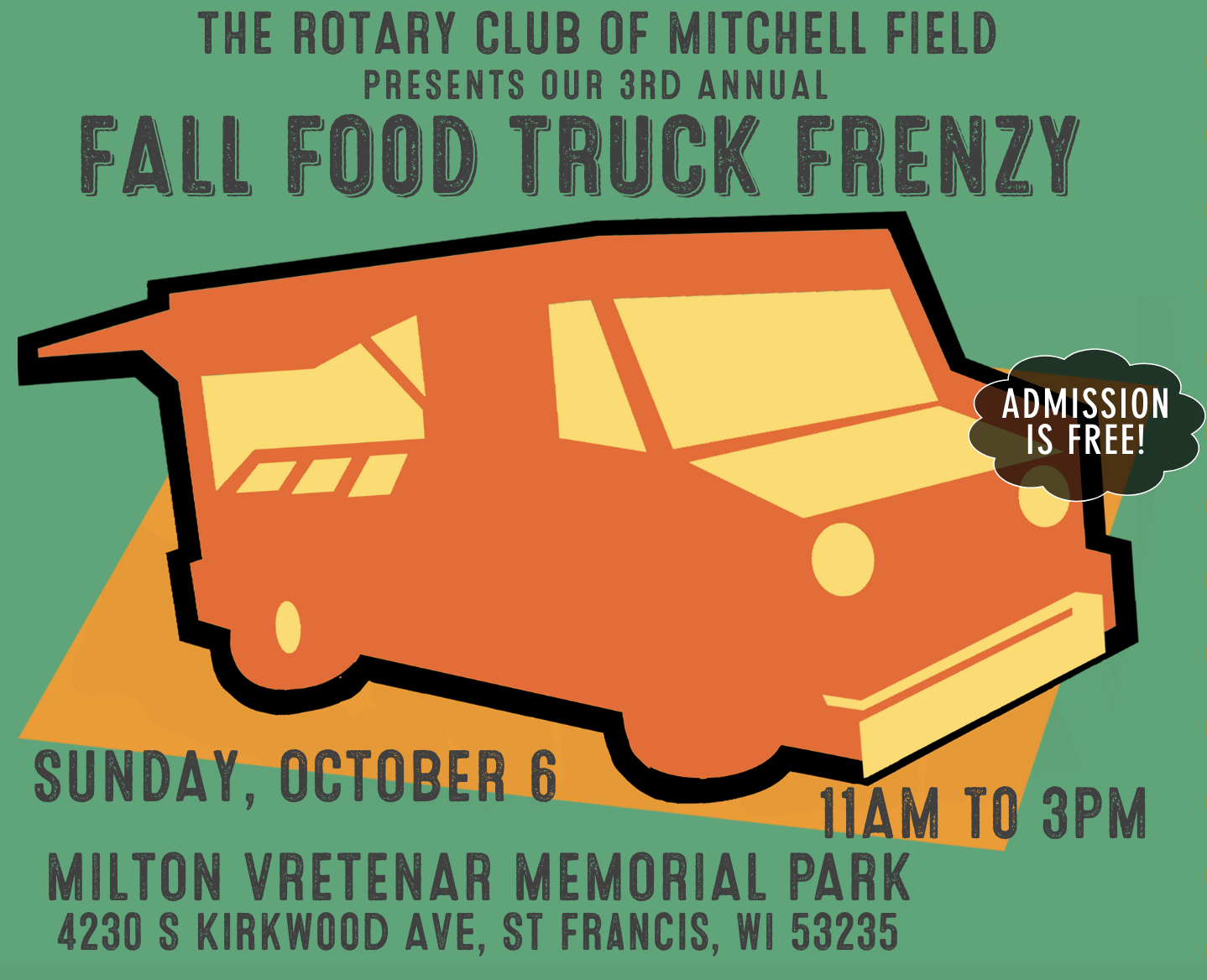 - Sunday, October 6: Rotary Club of Mitchell Field Food Truck Frenzy, 11 a.m.-3 p.m., Milton Vretnar Memorial Park, Saint Francis. Details