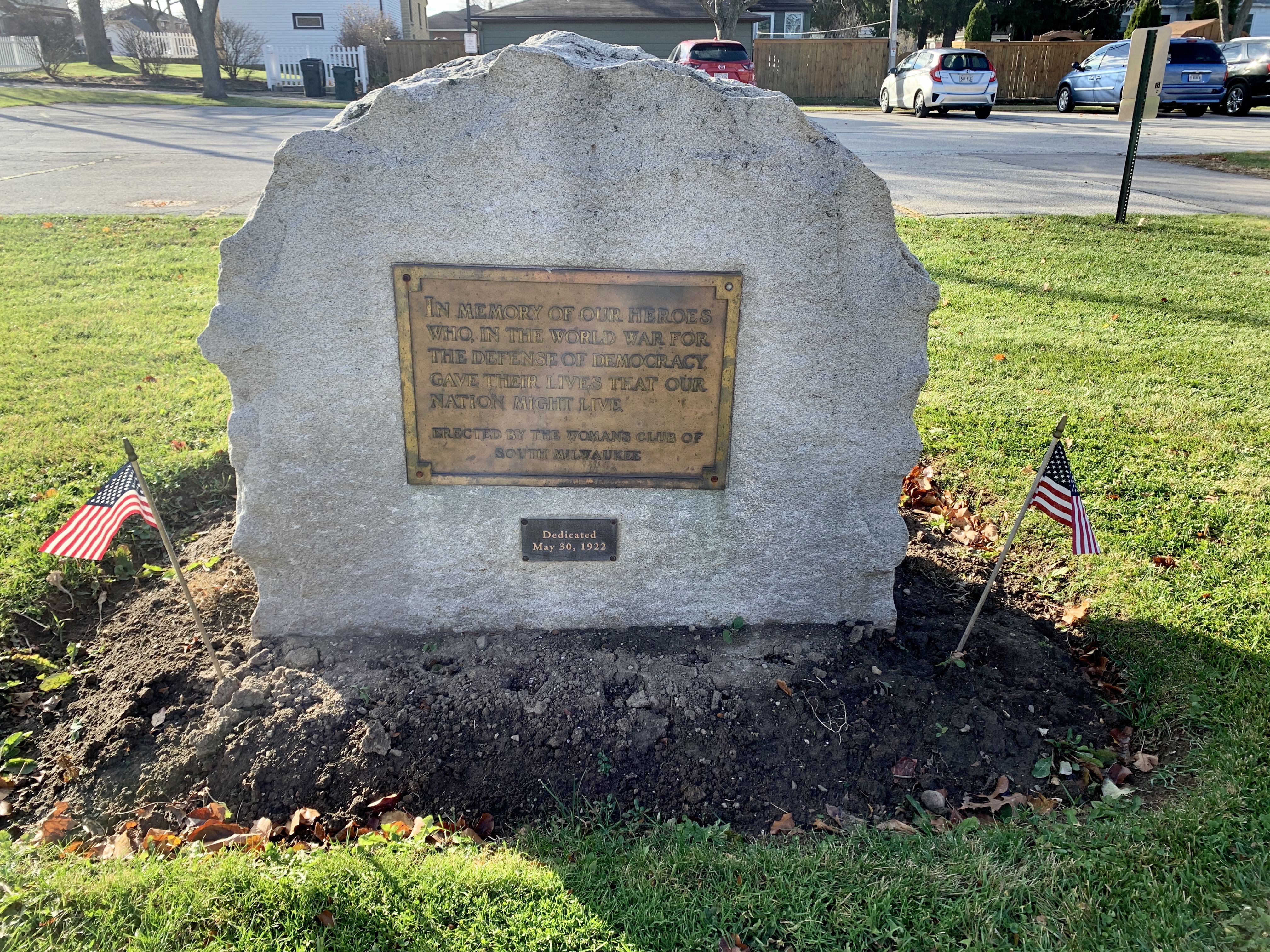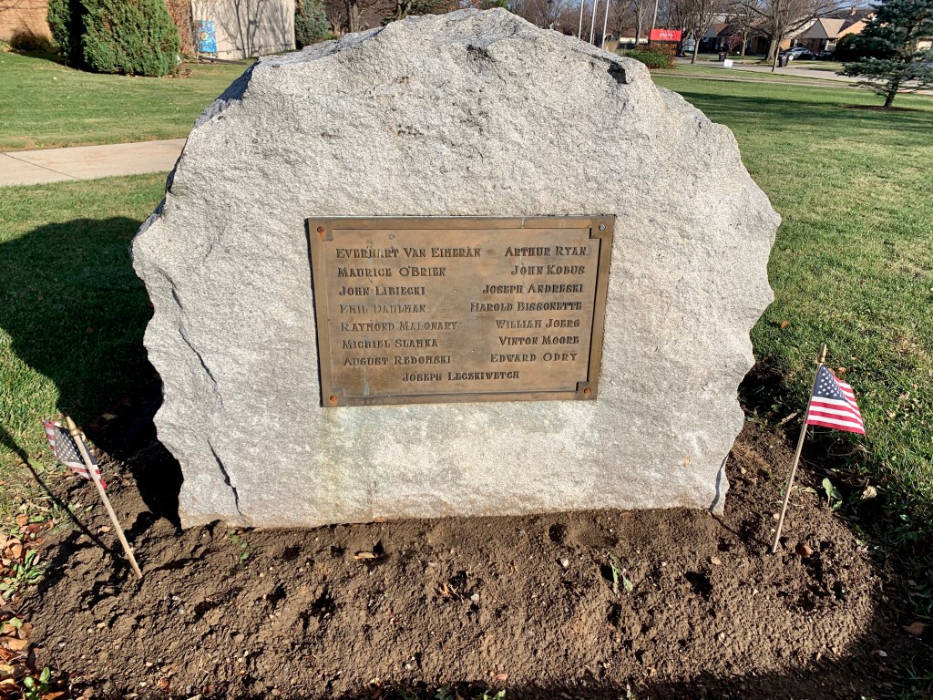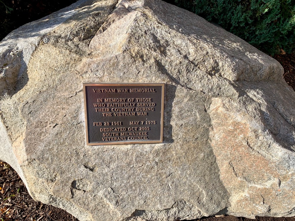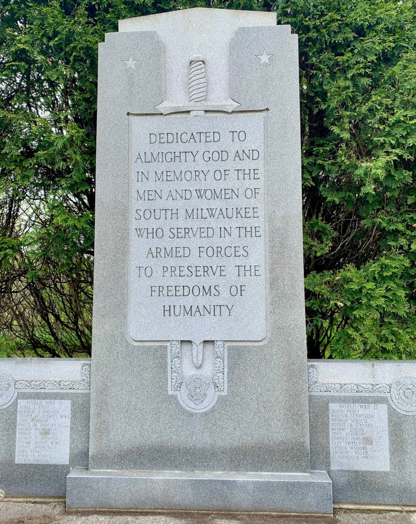 The South Milwaukee Veterans Memorial, located at 10th and Rawson Avenues, recognizes local residents killed in conflict, starting with World War I. An inscription reads, “Dedicated to almighty God and in memory of the men and women of South Milwaukee who served in the south armed forces to preserve the freedoms of humanity.”